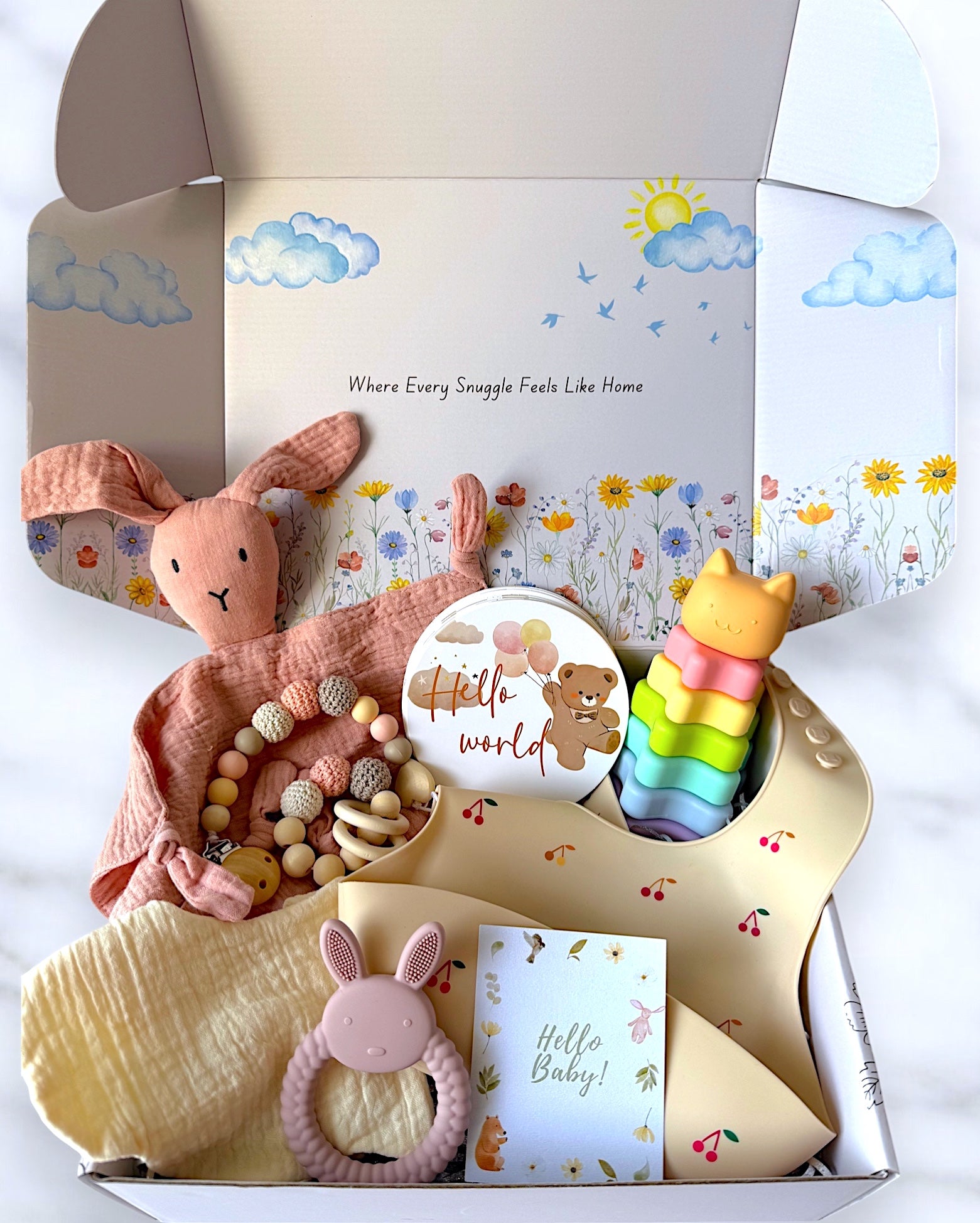 Thoughtfully curated for a baby girl's first flutter, this elevated bundle brings together snuggly keepsakes and modern essentials - offering comfort, calm, and a hint of everyday luxury. Each piece is lovingly nestled inside our signature Aurélia Box, beautifully packaged and ready to be gifted from the heart.