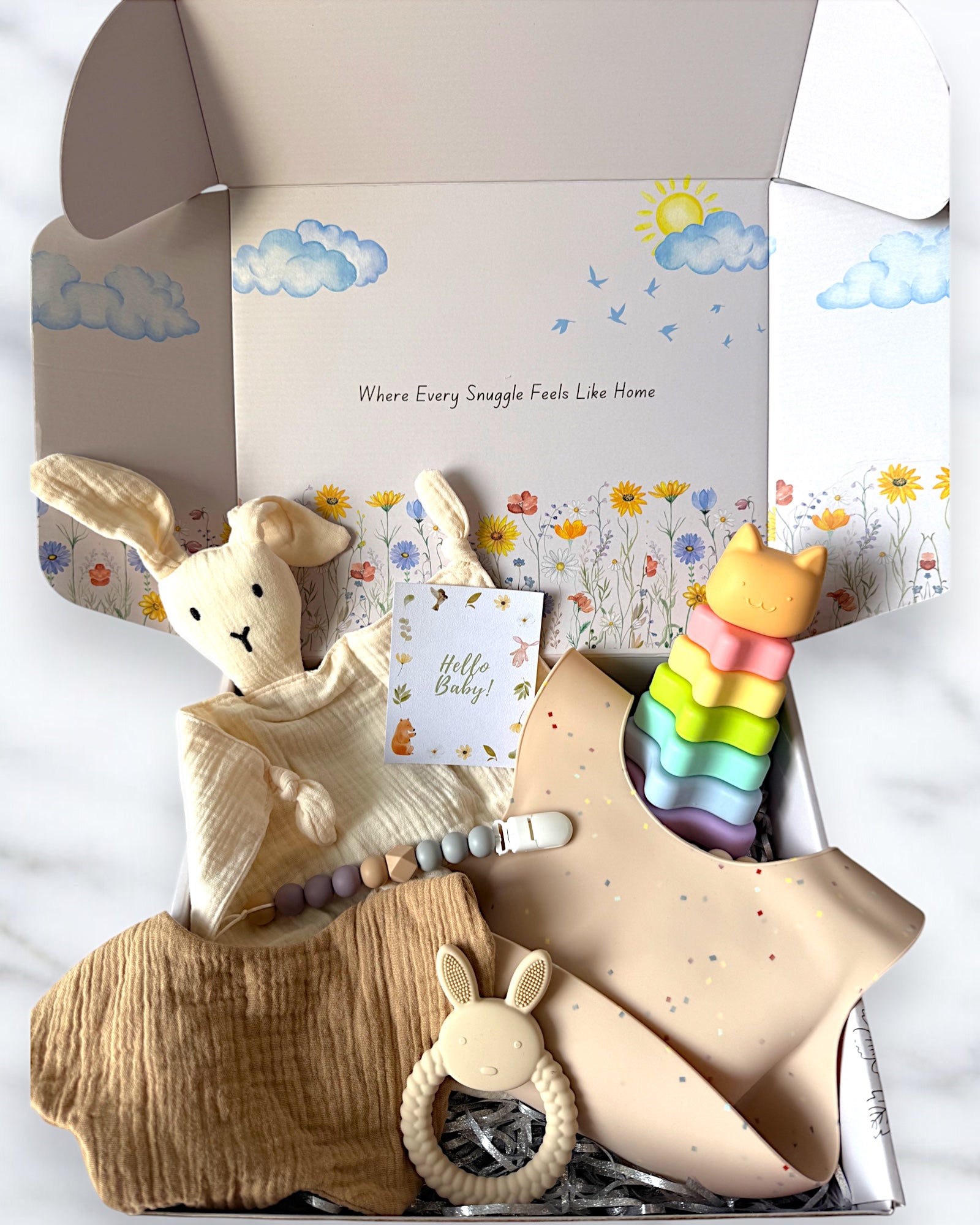 Thoughtfully curated for a little one’s first flutter into the world, this unisex bundle blends comforting textures with practical essentials—bringing ease, warmth, and a touch of wonder to every moment. Each piece is lovingly arranged inside our Aurélia Box, perfectly packaged and ready to be gifted with love.