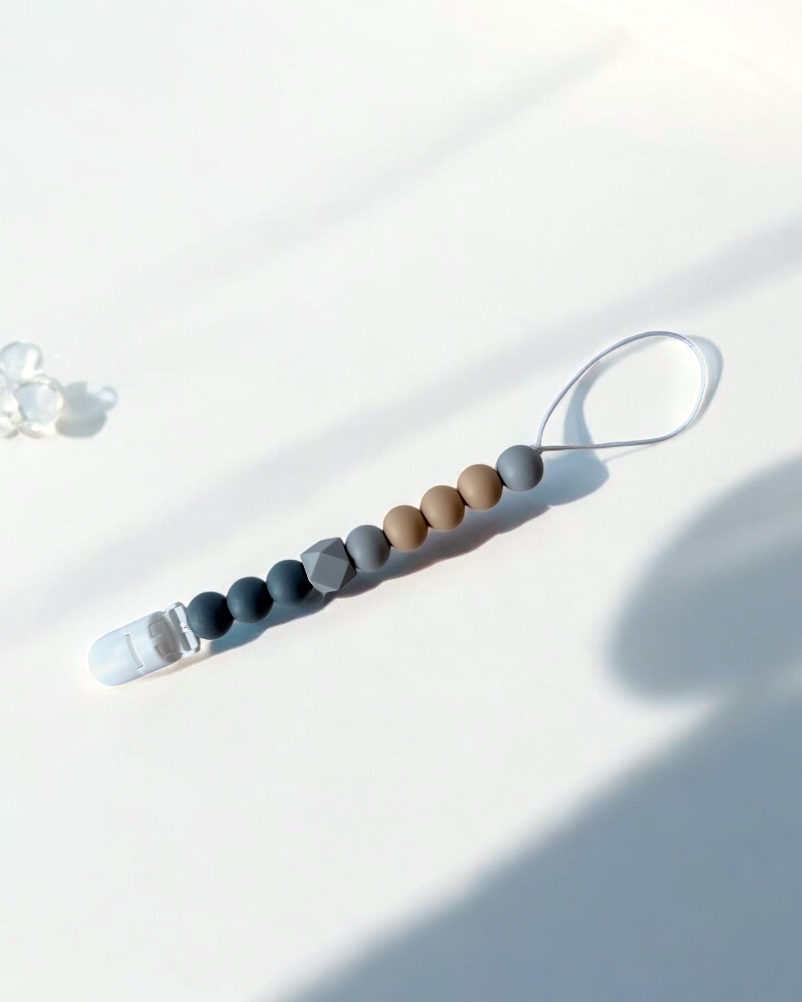 Crafted with textured silicone beads in chic, sculptural forms make this teether a soothing sensory experience to comfort the little ones. Thoughtfully designed to keep pacifiers in reach all day, every day.