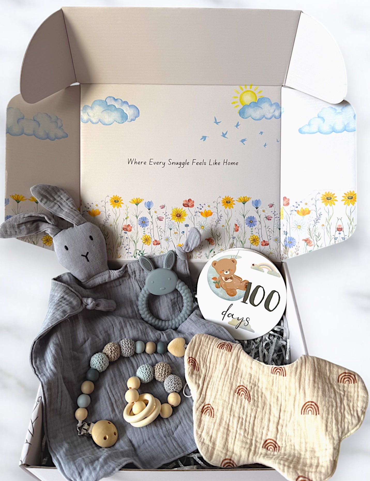 Curated with love for a baby boy’s earliest days, this set brings together comforting textures, timeless keepsakes, and modern essentials. From our signature bunny comforter to milestone cards for memory-making, each piece is thoughtfully arranged in our Aurélia Box. Beautifully packaged and ready to be gifted with heart.